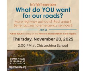 Now’s your chance to speak up! Join us at the Chistochina School for a public input meeting and help shape the future of transportation in our region.