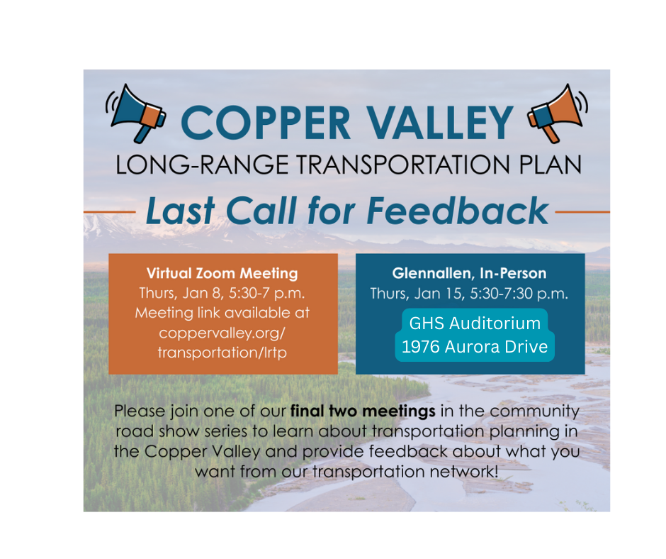 Join the Copper Valley Development Association and the CRV-RPO team for an in-person public input meeting to help shape the region’s Long-Range Transportation Plan (LRTP).